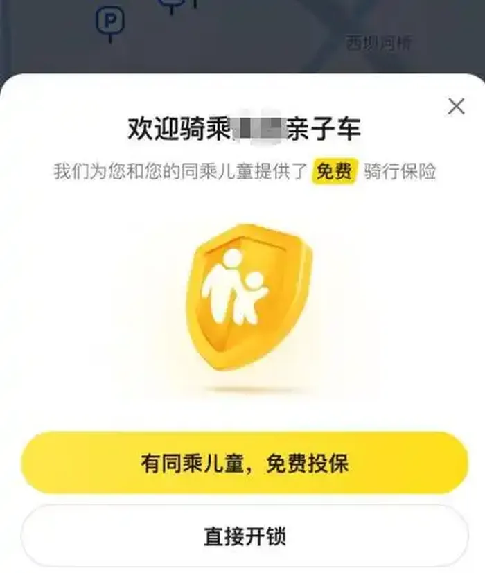 每次骑行中,亲子车为每位骑行的家长、乘坐的儿童都提供了免费的骑行保险,用户扫描亲子车后会出现投保的弹窗选项,保险主要用于用户在使用单车过程中遭受意外事故而导致的保险责任范围内的相关损失和费用。