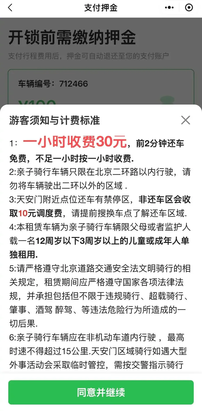 记者扫码后打开“亲子畅行”小程序,后续操作发现,亲子共享单车开锁前必须缴纳100元押金,收费标准是一小时30元,不足一小时按一小时收费,且车辆只限在北京二环路以内行驶,还车区域也有严格限制,如果将车停在非还车区域还会加收10元调度费。附近居民说: