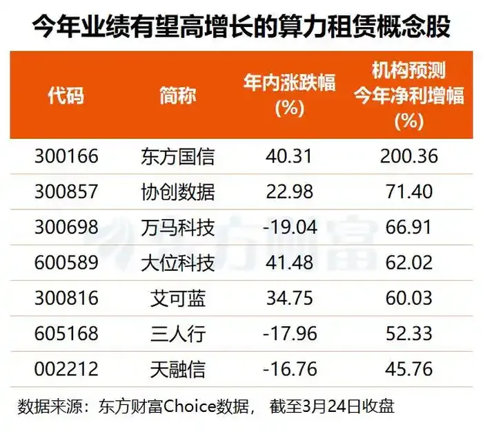 未来增长潜力方面,根据2家及以上机构预测,共7只算力租赁概念股今年有望实现四成以上的净利增长,其中,东方国信今年业绩或大幅改善,协创数据净利增幅有望超七成,万马科技、大位科技、艾可蓝的预测净利增幅均在60%以上。