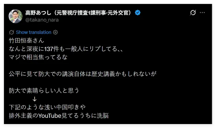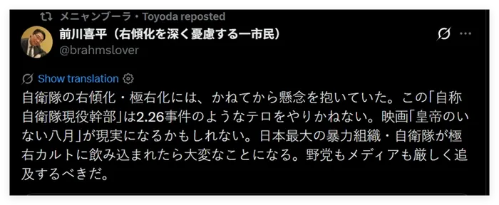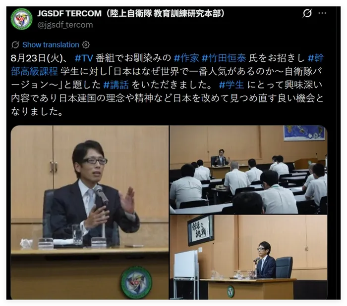 还有日本网民指出,过去这些年日本自卫队正在发生一些让人极为担忧的变化,比如他们曾多次邀请在历史问题和涉华议题上发表过极端言论的日本极右翼分子,去给自卫队的自卫官“上课”——比如一个名叫竹田恒泰的日本极右翼分子。