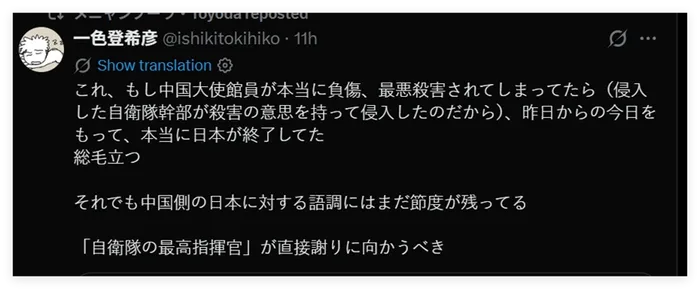 然而,截至目前,日方除了一句轻描淡写的“遗憾”,并没有向中国做出诚恳的道歉。有日本网民认为,考虑到高市在历史问题上的立场、恶劣的对华态度,以及她与日本一些恶劣的极右翼分子的暧昧关系,她恐怕是想在这件事上蒙混过关,而且也大概率不会去反思此事暴露出的日本自卫队内部越来越危险的右翼军国主义倾向。